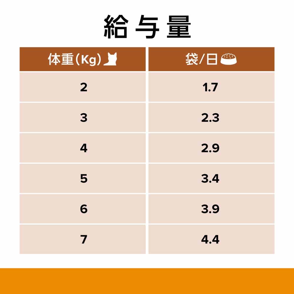 この食事量は開始時の目安です。ペットが適正な体重を維持できるように、必要に応じて量を調節してください。詳しくは獣医師にお問い合わせください。