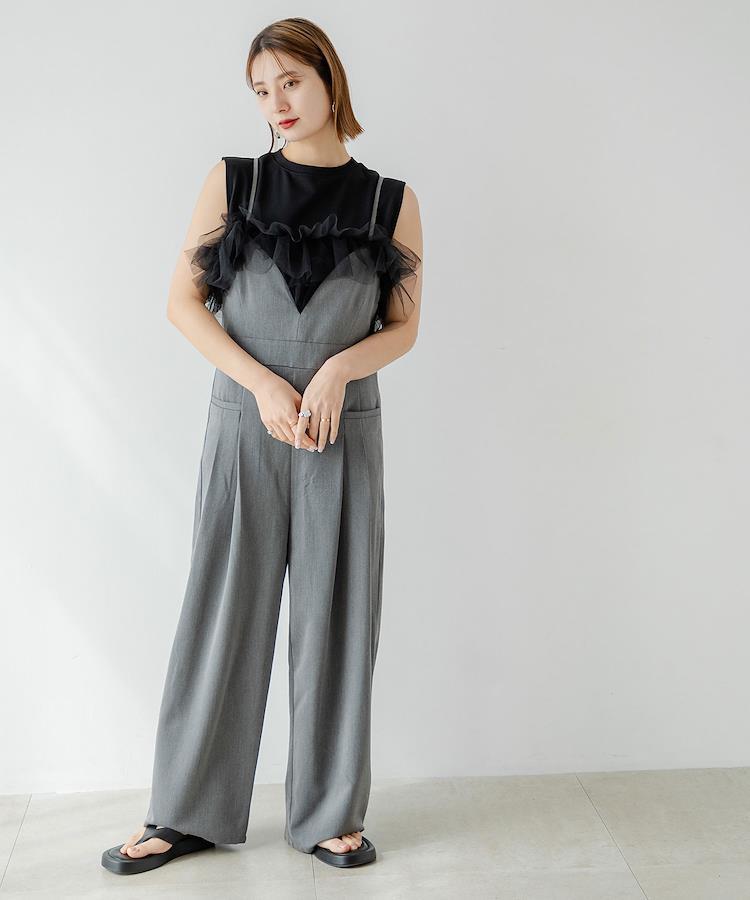 春夏はTシャツやタンクトップ、秋冬はニットとインナー次第でオールシーズン着用可能な素材感です。