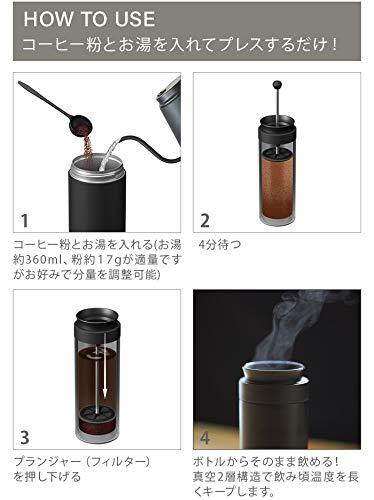 【毎日の食事の時間を大切にしている暮らしを丁寧に楽しむ人たちへシンプルで使いやすい家電を生み出すブランド Vitantonio】コーヒー粉とお湯を入れてプレスするだけで、レギュラーコーヒーの風味が手軽に楽しめるコーヒープレスボトル「COTTLE(コトル)」が入荷。コーヒープレスとステンレスボトルが一体になった便利な2in1のボトルです。これ一つで香り豊かなコーヒーを淹れられ、職場やアウトドアなど外出先でも使うことができます。真空2層式で保湿・保温にも優れているので、一年中使用することができます。■ブランド名 / 商品名Vitantonio ビタントニオ / COTTLE VCB-10■カラーブラック:NIGHT(N)ホワイト:CLOUD(C)グリーン:FOREST(F)■素材 / 仕様本体:ステンレス鋼(アクリル樹脂塗装)本体内側:ステンレス鋼キャップ 飲み口 ツマミ プランジャー:ポリプロピレン軸 フィルター:ステンレスパッキン:シリコンゴム保温効力:スタート時:95度(室温20度) 1時間後:86度以上 6時間後:59度以上スタート時:4度(室温20度) 6時間後:8度以下抽出量:約300ml(コーヒー)重さ:ボトル+キャップ+プランジャー:約320gボトル+キャップ:約280gボトルのみ:約190g満水容量:約 420ml適正容量:約 360ml備考:粗挽きコーヒー粉を使用してください。中挽きより細かいとフィルターの目詰まりの原因になります■生産国-■サイズ直径:7.2cm×高さ:24.7cm