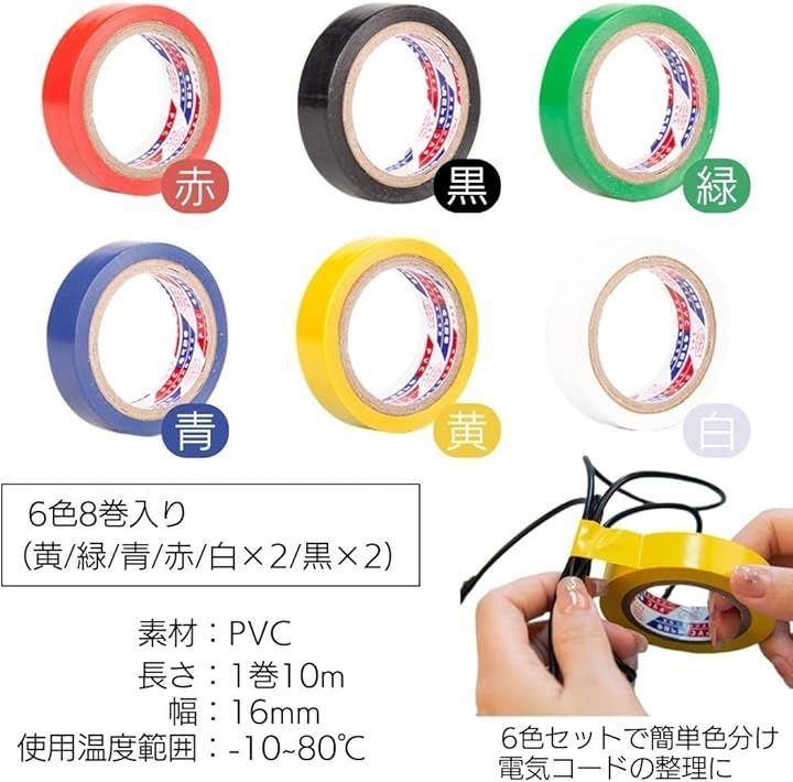 「商品詳細」セット内容:6色8巻入り(黄/緑/青/赤/白/黒) 素材:PVC 長さ:1巻10m 幅:16mm 使用温度範囲:-10~80℃