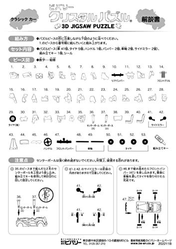 ~セット内容~パズルピース(車39個、タイヤ5個、ハンドル1個、バンパー2個、車軸2個、サイドミラー2個、センターポール2個)、組み立てキー1個、シール、解説書