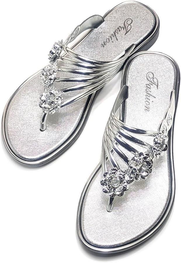 花のビジュー装飾が光に反射して、足元が一気に華やかに。夏のコーディネートに映えるきらきらアクセント。
