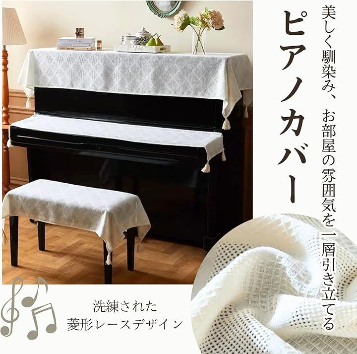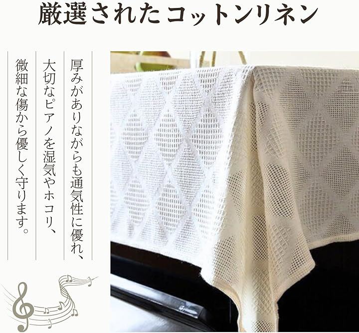 「多様なピアノ・サイズに対応」 ピアノカバーは一般的なアップライトピアノや電子ピアノに幅広く対応する汎用性の高いサイズ設計です。