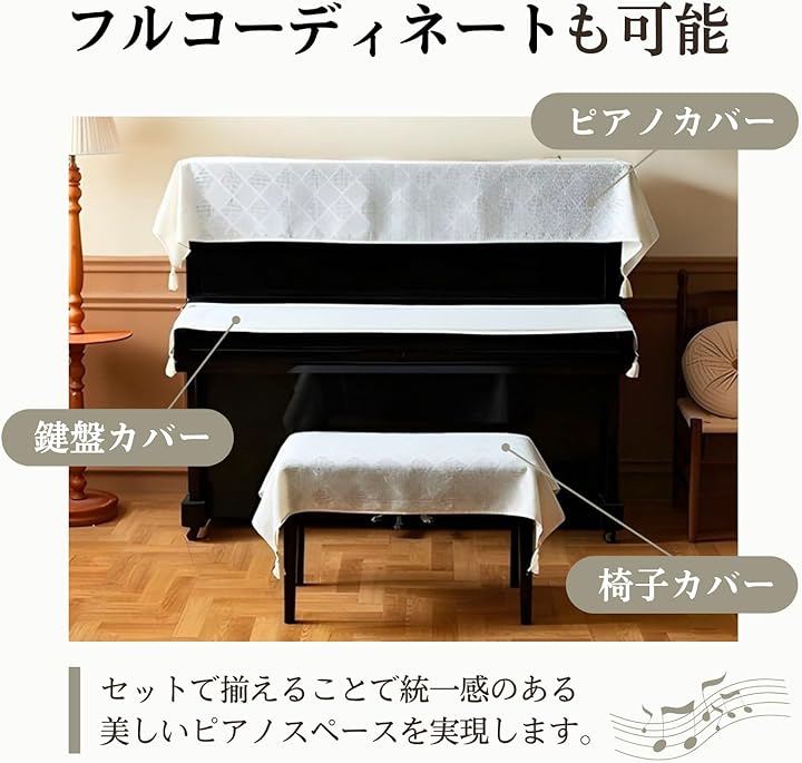 「フルコーディネートも可能」 ピアノカバー(半カバー)、椅子カバー、鍵盤カバーの3種類をご用意。