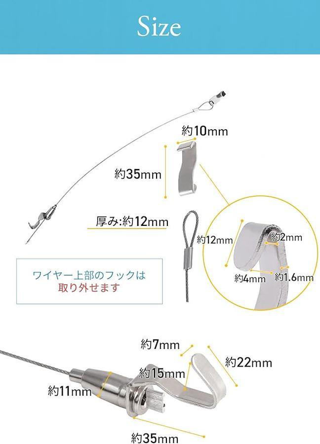 「使用方法」使用方法は非常にシンプルで、ワイヤーの上部レールフックなどにを引っかけ、ピクチャーフックを額縁の裏に引っ掛けるだけです。