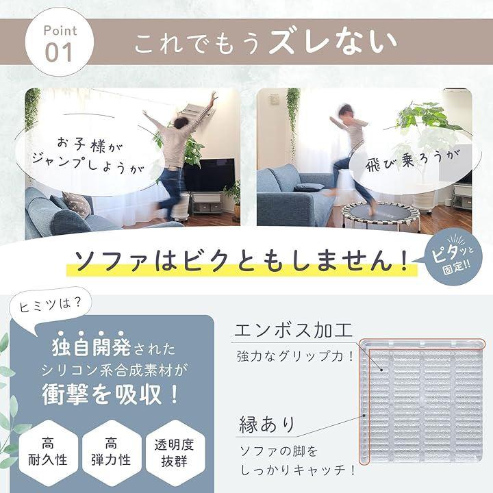 「置くだけ簡単」重たいソファを高く持ち上げてわざわざ履かせる必要はありません。わずか1cm浮かせて、さっと置くだけ。縁があるからソファの脚がズレ落ちません。軽いソファなら、女性一人でも設置可能です。