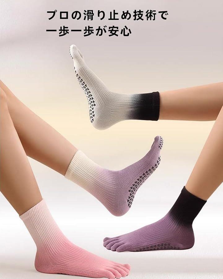 さらに各指先まで独立した滑り止め加工で、従来のヨガソックスよりグリップ力や安定性がアップ。