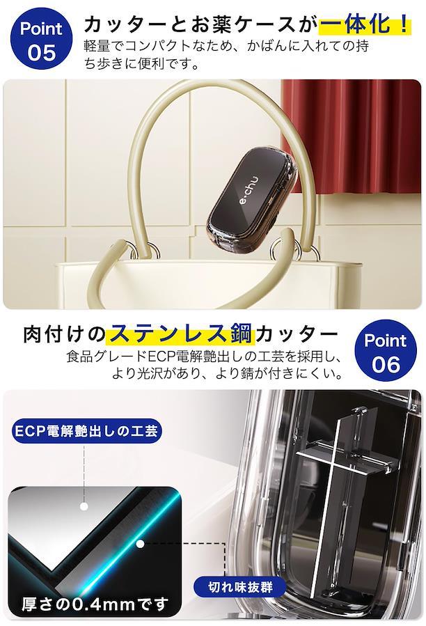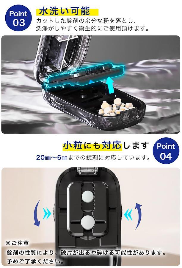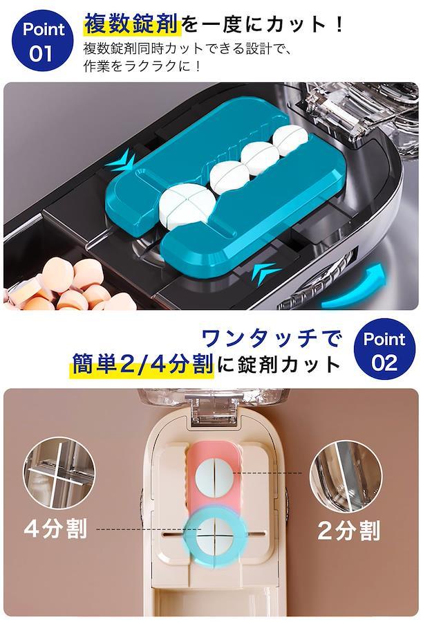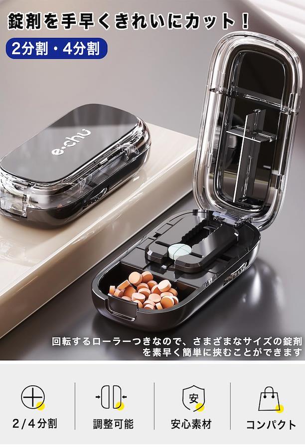 ?【複数の錠剤同時にカット】ピルカッターは、複数の錠剤を同時にカットできるため、手間を省き、効率的に作業ができます。※ご注意:錠剤の性質によっては、欠けたり砕けたりすることもあるので注意が必要です。 ?【革新的なデザインと高品質素材】十字型の刃で2分割、4分割が可能。ステンレス鋼のカッターとABS樹脂製のボディで、長期間使用可能な耐久性があります。 ?【おしゃれでコンパクト】厚みわずか2.3cmのコンパクトサイズで軽量設計のため、持ち運びにも便利です。カバンに入れて容易に持ち歩けるため、旅行や出張時にも適しています。 ?【多機能・薬ケース付き】薬収納スペースも設けてあるため、外出時に必要な薬を一緒に収納することが可能です。 ?【いろんなシーンで大活躍】海外製の錠剤や高齢者、子ども、ペットにも対応しており、様々なシーンで活躍します。