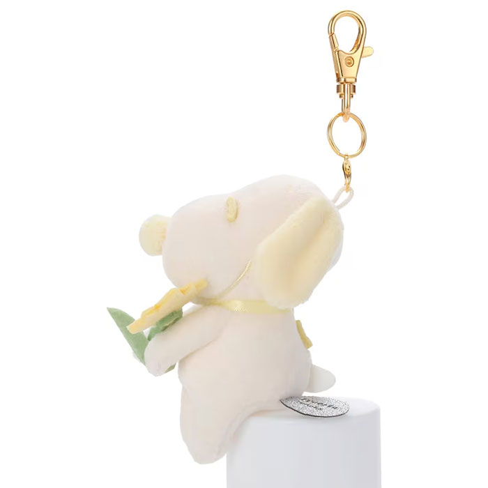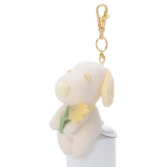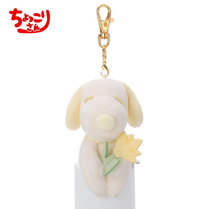 お花を持ったスヌーピーが、ちょっこりと癒しを届けるこのマスコットは、プレゼントとして喜んでいただけるギフトアイテムです。