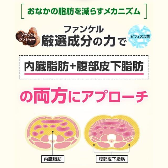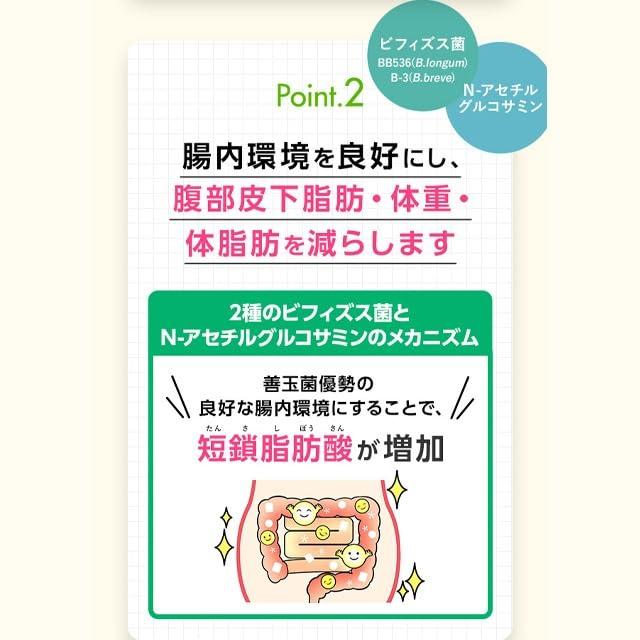 【体重・体脂肪、おなかの脂肪を減らす!】腸内環境を良好にし、体重・体脂肪を減らす2種のビフィズス菌とN-アセチルグルコサミンを配合。脂肪を消費しやすくするブラックジンジャー(ポリメトキシフラボン)をさらに配合することで、おなかの脂肪(内臓脂肪・腹部総脂肪)を減らします。 独自技術「バリア&リリース製法」で、成分を守って届けることにもこだわりました。 【こんな方におすすめ】肥満気味でBMIが高めの方、お腹の脂肪が気になる方、生活習慣をなかなか変えられないが対策をしたいと思っている方に。【ご注意】 ※妊娠・授乳中の方、お子様はお召し上がりにならないでください。ブラックジンジャー配合により、カプセルの色がグレーになっています。 【届出表示】本品にはブラックジンジャー由来ポリメトキシフラボン、生きたビフィズス菌 BB536(B.longum)・B-3(B.breve)、N-アセチルグルコサミンが含まれます。ブラックジンジャー由来ポリメトキシフラボンは、脂肪を消費しやすくすることで、お腹の脂肪(内臓脂肪、腹部総脂肪)を減らす機能が報告されています。生きたビフィズス菌BB536(B.longum)・B-3(B.breve)、N-アセチルグルコサミンは、腸内環境を良好にし、お腹の脂肪(腹部皮下脂肪、腹部総脂肪)、体重・体脂肪を減らすことで、高めのBMIを改善する機能が報告されています。肥満気味でBMIが高めの方、お腹の脂肪が気になる方に適しています。 【1日の目安】3粒 【機能性関与成分/1日3粒当たり】 ブラックジンジャー由来ポリメトキシフラボン:12mg、ビフィズス菌BB536(B.longum):100億個、ビフィズス菌B-3(B.breve):50億個、N-アセチルグルコサミン:238mg 【機能性表示食品についてのご注意】 ※本品は、特定保健用食品と異なり、消費者庁長官による個別審査を受けたものではありません。 ※疾病の診断、治療、予防を目的としたものではありません。 ※食生活は、主食、主菜、副菜を基本に、食事のバランスを。 【アレルゲン(28品目中)】 えび・かに・卵・乳