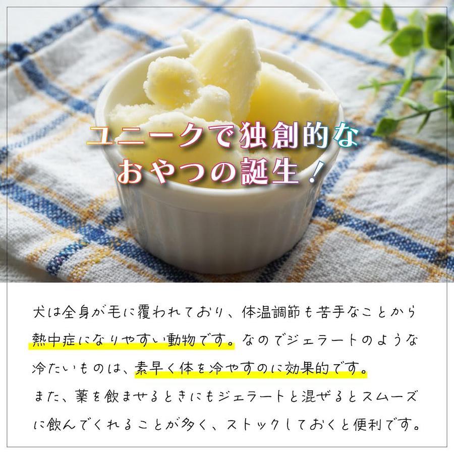 凍らせるだけで夏のご褒美♪作って楽しい♪食べて美味しい♪100%ナチュラル原料の愛犬用ジェラート。暑い日の体温調節や食欲不振のわんちゃんにオススメ。【作り方】 カップに水 (約 80ml) を加え、フタをしっかりと閉め、全体が混ざるまで約 30 秒間振ってください。その後、冷凍庫で約3時間休ませます。 アイスは冷凍庫で保存し、10日以内にお召し上がりください。 製品は直射日光を避け涼しく乾燥した場所にそのまま保管してください。 推奨量を超えると、お腹が緩くなる可能性があります。 ※本製品1個(40g)で約120gのジェラートが作れます。