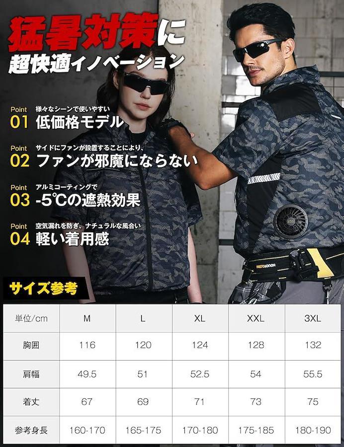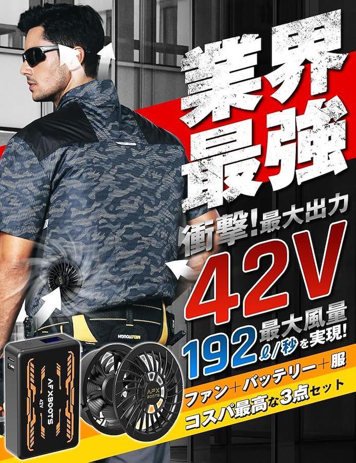 「42Vファン付きベスト」・最高出力42V。・最大風量192L/S。・最大回転数8900RPM。・30000mAh超大容量バッテリー付。・5.5時間急速充電。・-5℃遮熱効果ベスト。