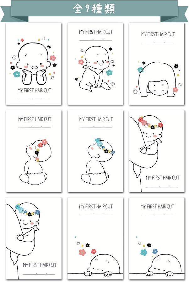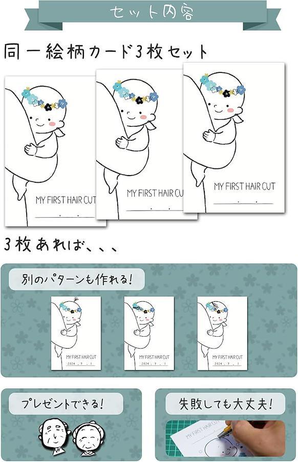 用意するアイテムはこれだけ ・はさみ&くし(ハサミは刃先が丸まっているもの) ・テープ(カットされた紙をまとめる用) ・カッター(台紙に切れ込みを入れる用) セット内容 ファーストカット台紙3枚セット はがきサイズ 100x148mm