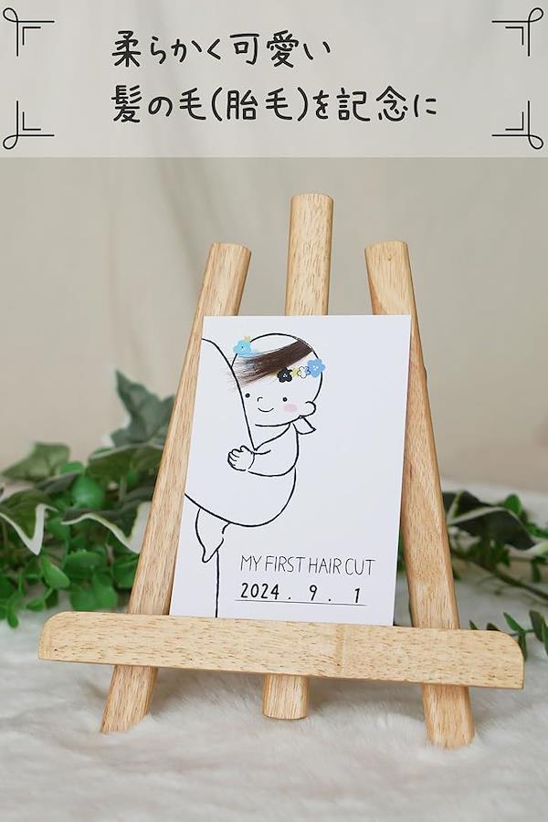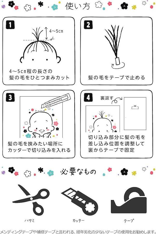 「 楽しくカンタンに 」台紙に切れ込みを入れて、髪の毛を挟むだけ。ママが自分で簡単にできて、一生残る記念アイテム。