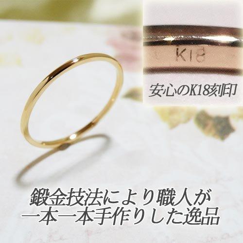 K18YG(イエローゴールド)、K18WG(ホワイトゴールド)、K18PG(ピンクゴールド)の3種類からお選び頂けます。リングサイズを選択肢からお選びください。幅・厚み共に1mm 、重さは平均0.8グラム程度