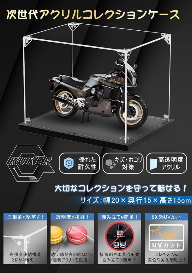 優れた耐久性と高い透明度を兼ね備えているため、ホコリやキズから守ると同時にコレクションをアクリル越しでもキレイに魅せます。