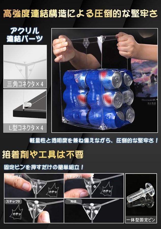「高強度連結構造」次世代フィギュアケースの登場です。衝撃や揺れでも崩れない三角コネクタ構造により堅牢性を実現。