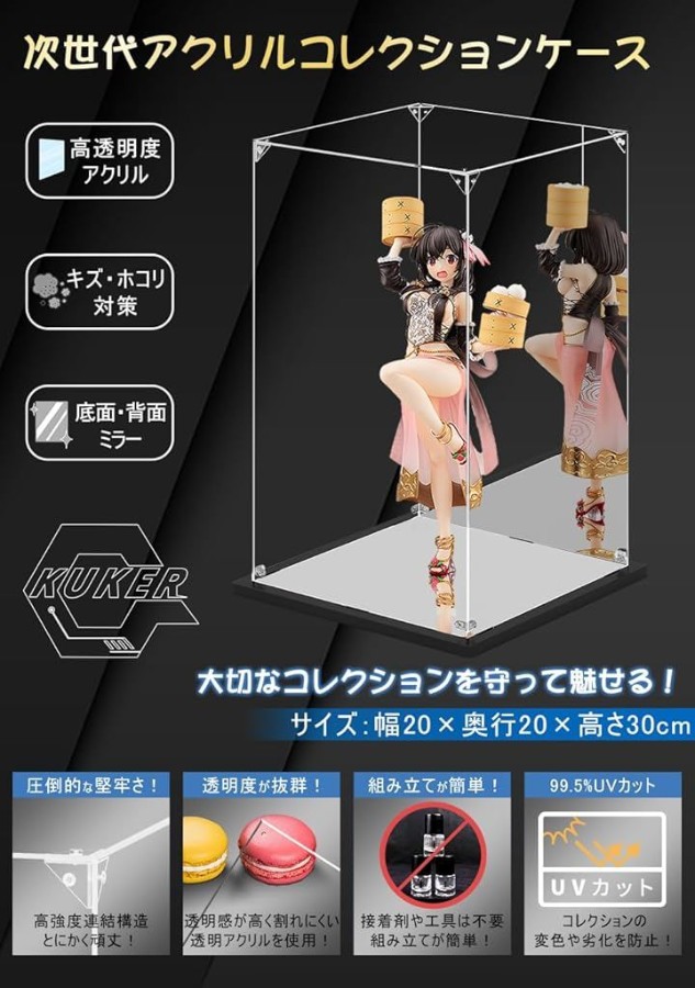 優れた耐久性と高い透明度を兼ね備えているため、ホコリやキズから守ると同時にコレクションをアクリル越しでもキレイに魅せます。