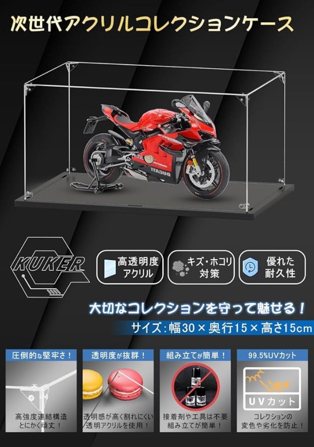 優れた耐久性と高い透明度を兼ね備えているため、ホコリやキズから守ると同時にコレクションをアクリル越しでもキレイに魅せます。