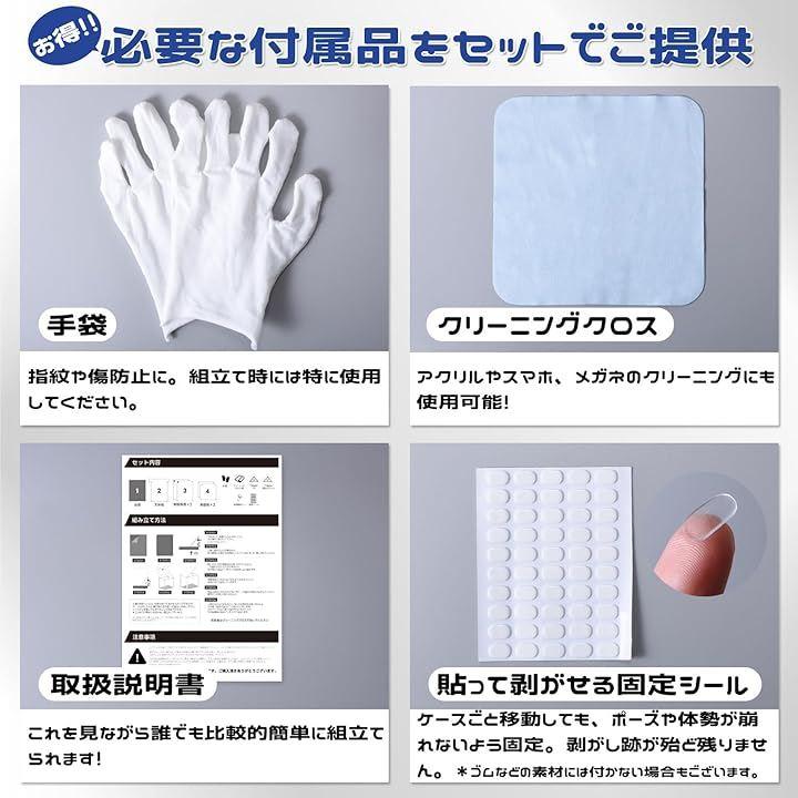 *付属品には、メガネやスマホにも使える、クリーニンググロス、組立て時に使用する左右手袋、説明書、剥がし跡が殆ど残らない 貼って剥がせる固定シール付きです。