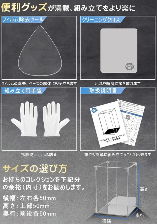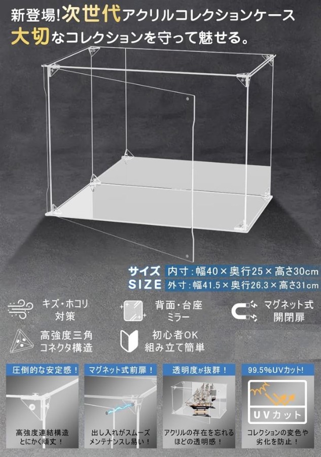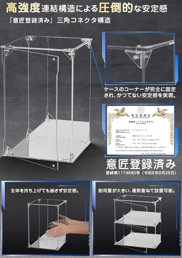 「高強度連結構造」次世代フィギュアケースの登場です。衝撃や揺れでも崩れない三角コネクタ構造により堅牢性を実現。