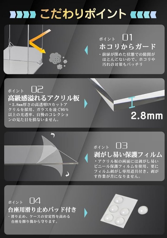 「高強度連結構造」次世代フィギュアケースの登場です。衝撃や揺れでも崩れない三角コネクタ構造により堅牢性を実現。