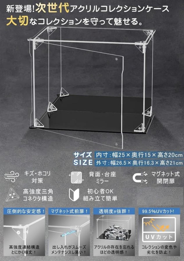 「マグネット付きの扉」マグネットドア構造により開閉が簡単に行えるため、コレクションの出し入れのためにアクリルケースを分解する必要がありません。