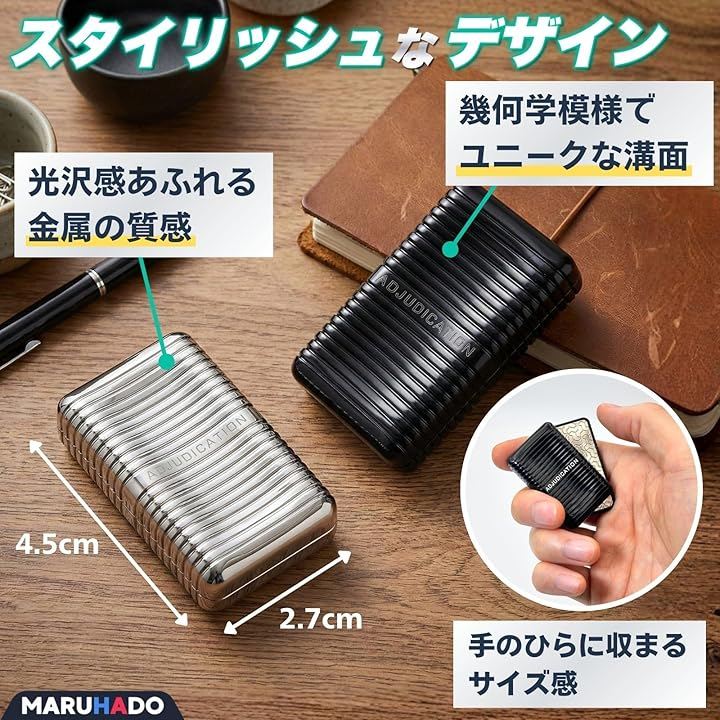 「内容物」本体x1、ハードケースx1、収納袋x1、拭き取りクロスx1、メンテナンス工具、図解説明書 「材質」高品質メタル 「サイズ」約45mmx27mmx16mm 「重量」約89g 「カラー」ブラック(黒)、シルバー(銀) 「注意点」*スライド時の金属音や磁力による反応には個体差がある場合がございます。
