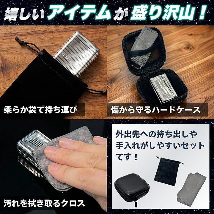 収納袋やクリーニングクロスも付属しているため、外出先への持ち運びも簡単です。