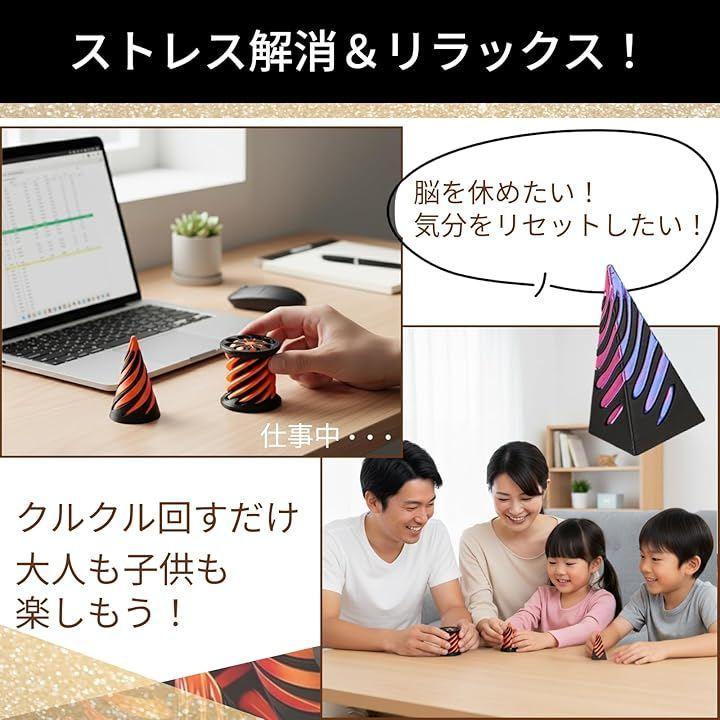 「3個セット&ギフトに最適」 ピラミッド・円錐・円柱の3種類がセットになっており、それぞれ異なる回転体験を楽しめます。