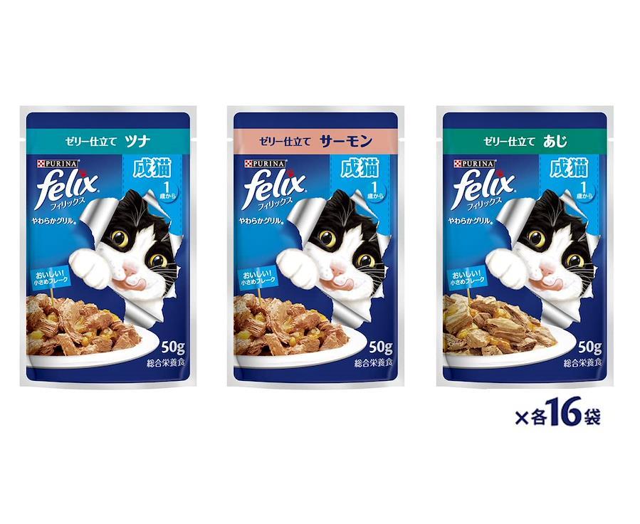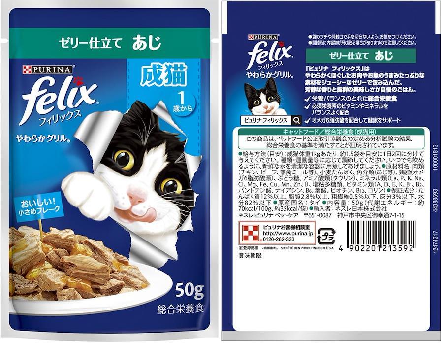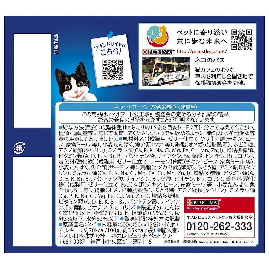 やわらかくほぐしたお魚のうまみをジューシーなゼリーで包み込んだごはん。 お魚大好きネコさんにツナ・サーモン・あじの3種類が入ったバラエティパック。ツナ・サーモン・あじ 各16袋入り原材料:【成猫用 ゼリー仕立て ツナ】肉類(チキン、ビーフ、家禽ミール 等)、小麦たんぱく、魚介類(ツナ 等)、鶏脂(オメガ6脂肪酸源)、ぶどう糖、アミノ酸類(タウリン)、ミネラル類(Ca、P、K、Na、Cl、Mg、Fe、Cu、Mn、Zn、I)、増粘多糖類、ビタミン類(A、D、E、K、B1、B2、パントテン酸、ナイアシン、B6、葉酸、ビオチン、B12、コリン)、着色料(酸化鉄)【成猫用 ゼリー仕立て サーモン】肉類(チキン、ビーフ、家禽ミール 等)、小麦たんぱく、魚介類(サーモン 等)、鶏脂(オメガ6脂肪酸源)、ぶどう糖、アミノ酸類(タウリン)、ミネラル類(Ca、P、K、Na、Cl、Mg、Fe、Cu、Mn、Zn、I)、増粘多糖類、ビタミン類(A、D、E、K、B1、B2、パントテン酸、ナイアシン、B6、葉酸、ビオチン、B12、コリン)、着色料(酸化鉄)【成猫用 ゼリー仕立て あじ】肉類(チキン、ビーフ、家禽ミール 等)、小麦たんぱく、魚介類(あじ 等)、鶏脂(オメガ6脂肪酸源)、ぶどう糖、アミノ酸類(タウリン)、ミネラル類(Ca、P、K、Na、Cl、Mg、Fe、Cu、Mn、Zn、I)、増粘多糖類、ビタミン類(A、D、E、K、B1、B2、パントテン酸、ナイアシン、B6、葉酸、ビオチン、B12、コリン)原産国:タイ