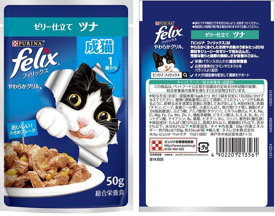 【成猫用 ゼリー仕立て ツナ】肉類(チキン、ビーフ、家禽ミール 等)、小麦たんぱく、魚介類(ツナ 等)、鶏脂(オメガ6脂肪酸源)、ぶどう糖、アミノ酸類(タウリン)、ミネラル類(Ca、P、K、Na、Cl、Mg、Fe、Cu、Mn、Zn、I)、増粘多糖類、ビタミン類(A、D、E、K、B1、B2、パントテン酸、ナイアシン、B6、葉酸、ビオチン、B12、コリン)、着色料(酸化鉄) 【成猫用 ゼリー仕立て サーモン】肉類(チキン、ビーフ、家禽ミール 等)、小麦たんぱく、魚介類(サーモン 等)、鶏脂(オメガ6脂肪酸源)、ぶどう糖、アミノ酸類(タウリン)、ミネラル類(Ca、P、K、Na、Cl、Mg、Fe、Cu、Mn、Zn、I)、増粘多糖類、ビタミン類(A、D、E、K、B1、B2、パントテン酸、ナイアシン、B6、葉酸、ビオチン、B12、コリン)、着色料(酸化鉄)