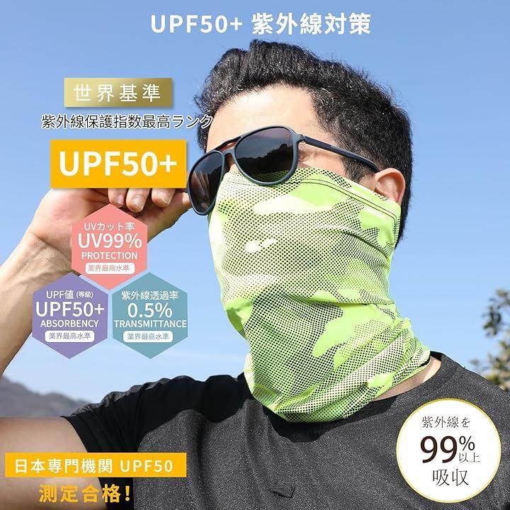 「UVカット率99%&UPF50+で紫外線対策バッチリ。」検査機関による測定で、UVカット率99%・紫外線保護指数UPF50+を実証。顔だけでなく首の後ろまで360°カバーする日除けマスクです。
