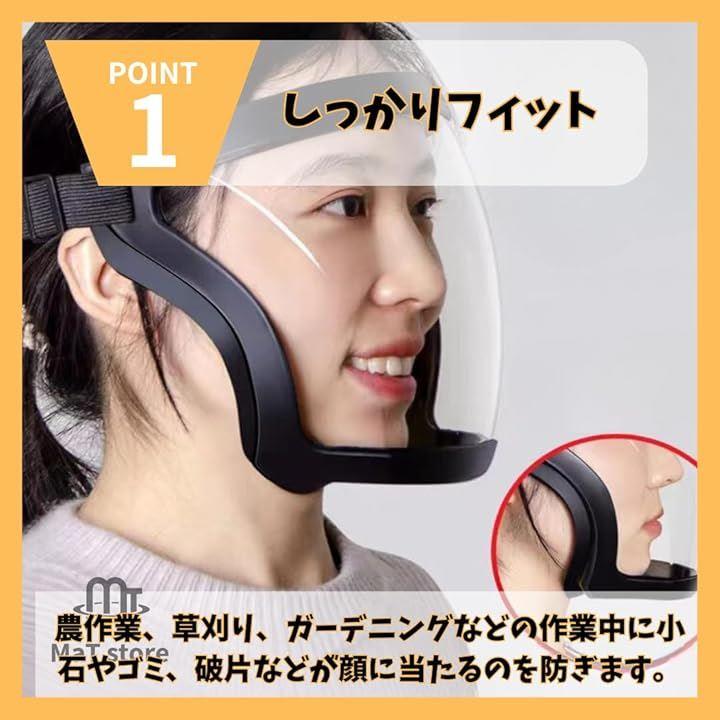 「フェイスガード」農作業、草刈り、ガーデニングなどの作業中に小石やゴミ、破片などが顔に当たるのを防ぎます。