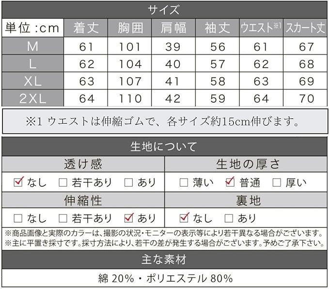 「長時間の着用が楽、ウエスト伸縮。」スカートは、ウエストが伸縮性のゴム仕様で簡単脱着。トップスとスカートが分かれている上、ストレッチ素材のサラサラ生地で長時間の着用も疲れにくい。