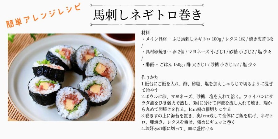 付属の甘口馬刺しタレとおろし生姜で、解凍後すぐにお召し上がりいただけます。