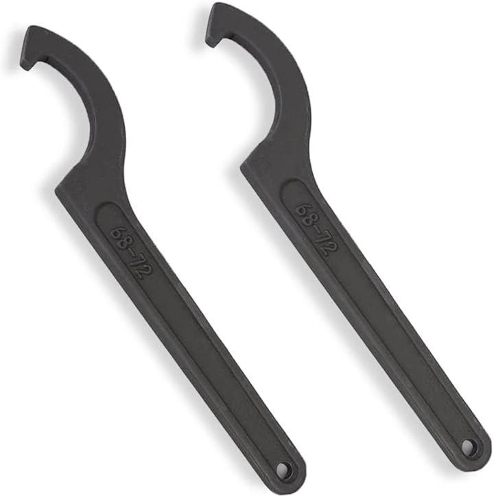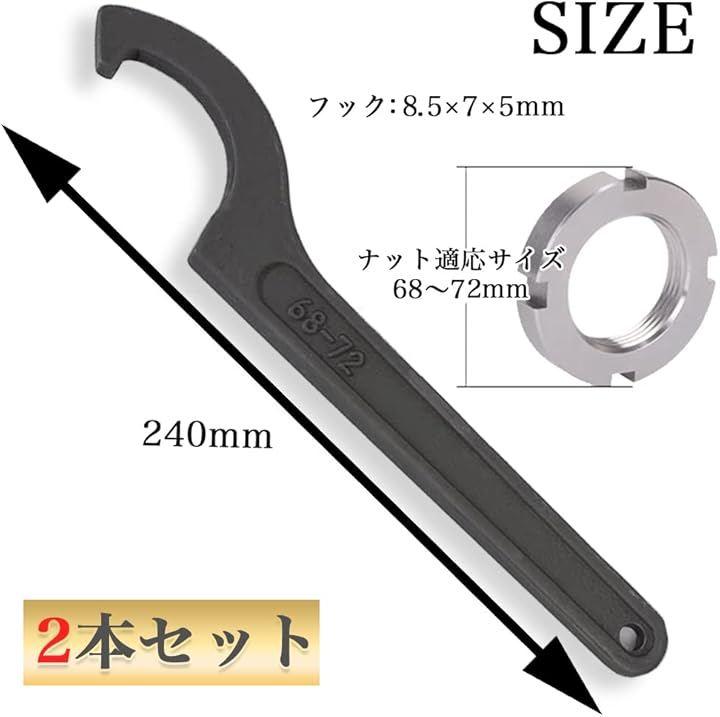 「商品内容」フックレンチ:2本セット サイズ:全長240mm フック8.5x7x5mm ナット適応サイズ:68~72mm 重量:300g / 個 素材:クロムバナジウム鋼