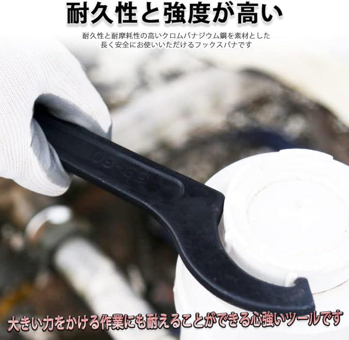 「耐久性の高いツール」耐久性と耐摩耗性の高いクロムバナジウム鋼を素材としたフックスパナですので、長く安全にお使いいただけます。