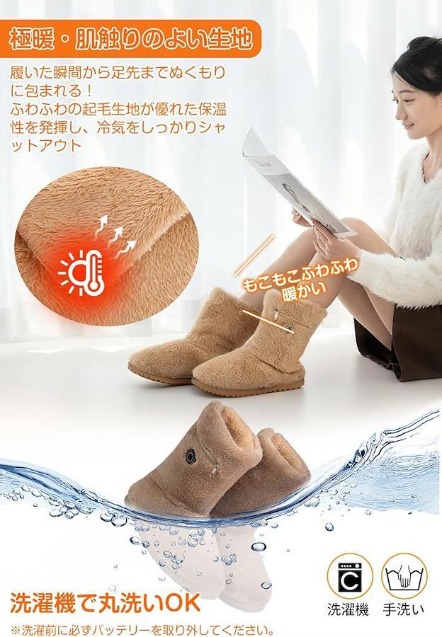 おしゃれなミドル丈ブーツ型の足温器は足先からふくらはぎまでやさしく包み込み、極細繊維が空気をたっぷり含んで高い保温力を発揮します。