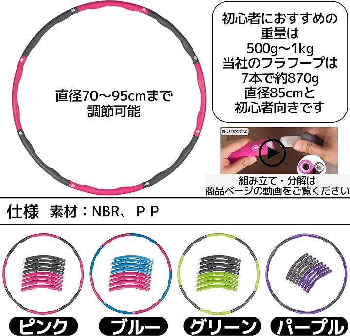 「初心者から使えるサイズと重さ」 軽すぎると遠心力が付きにくいため、フラフープ初心者には遠心力がつけやすい重量500g~1kgくらいがおすすめです。