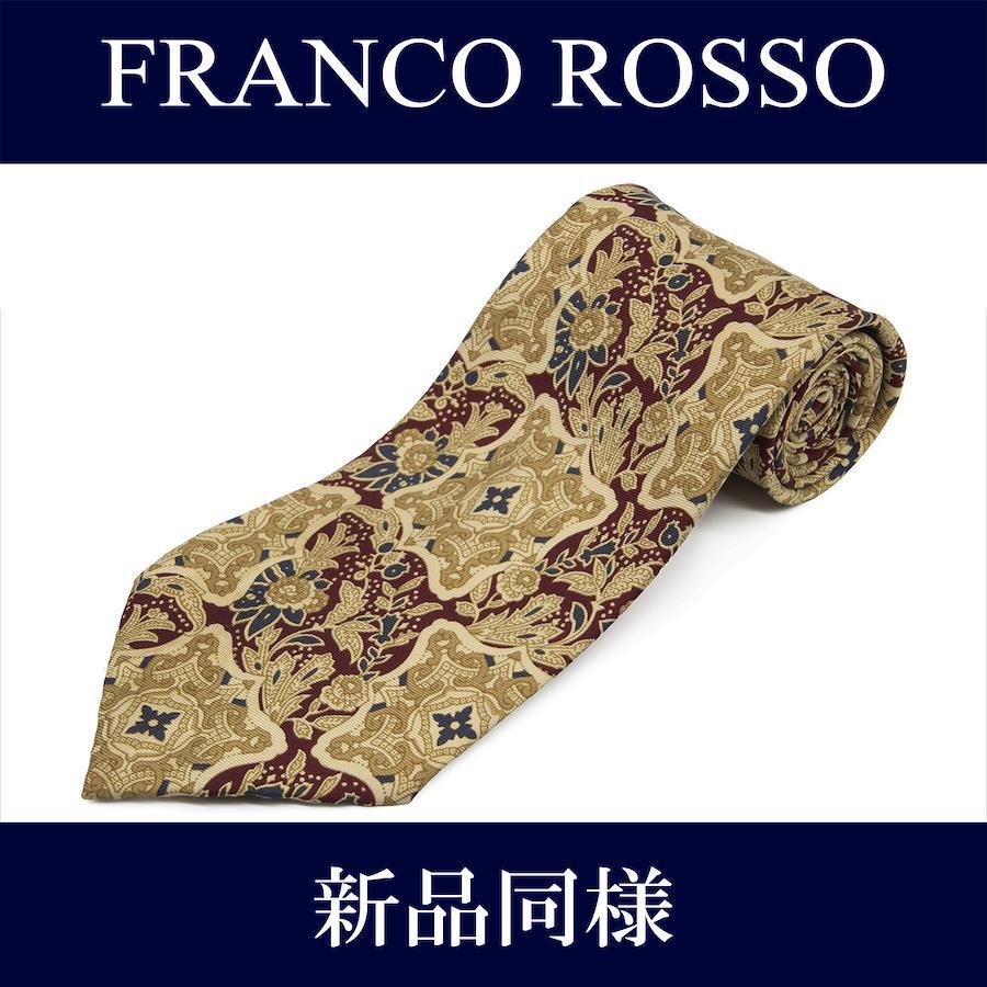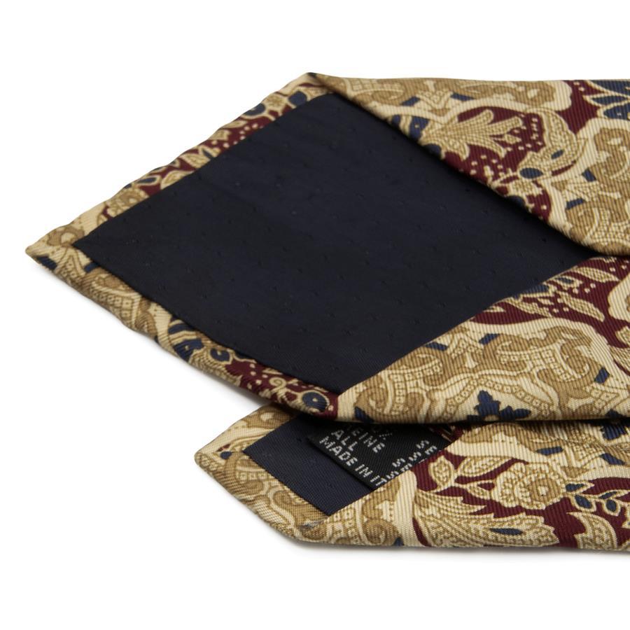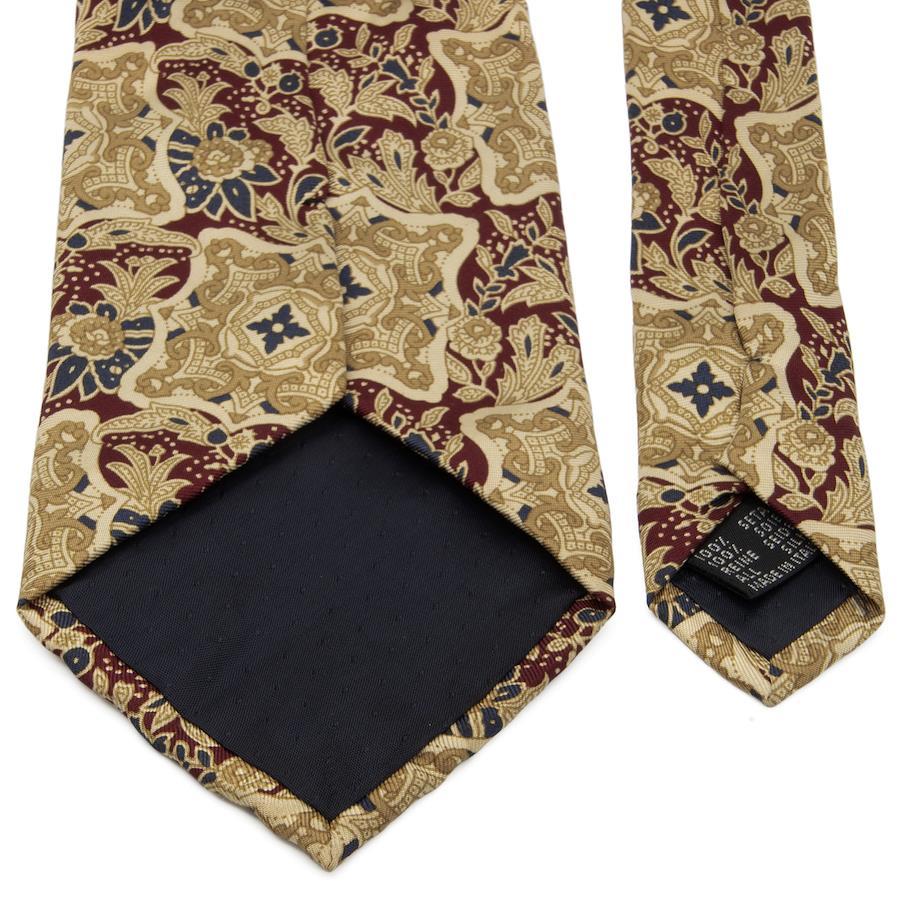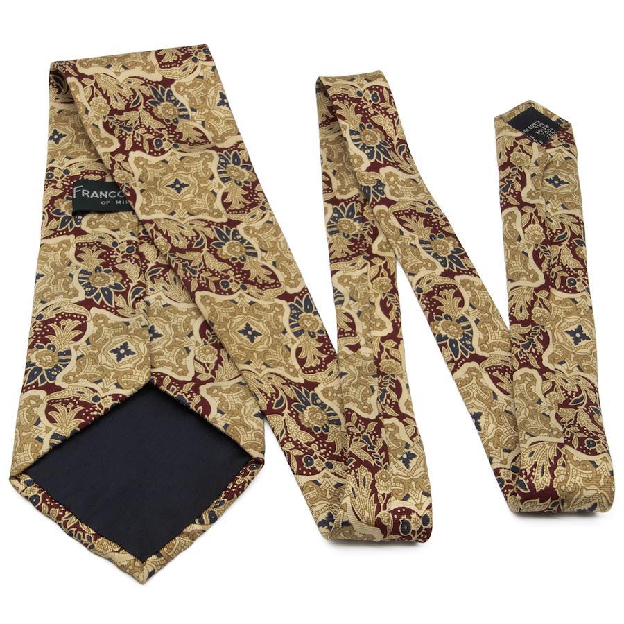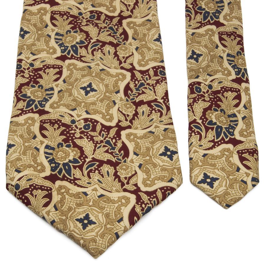 こちらのネクタイは、バーガンディーを基調とした深みのある色合いで、ベージュや黄土色の花柄が織りなすエスニックな総柄デザインは、お客様の胸元に個性と華やかさを添えます。