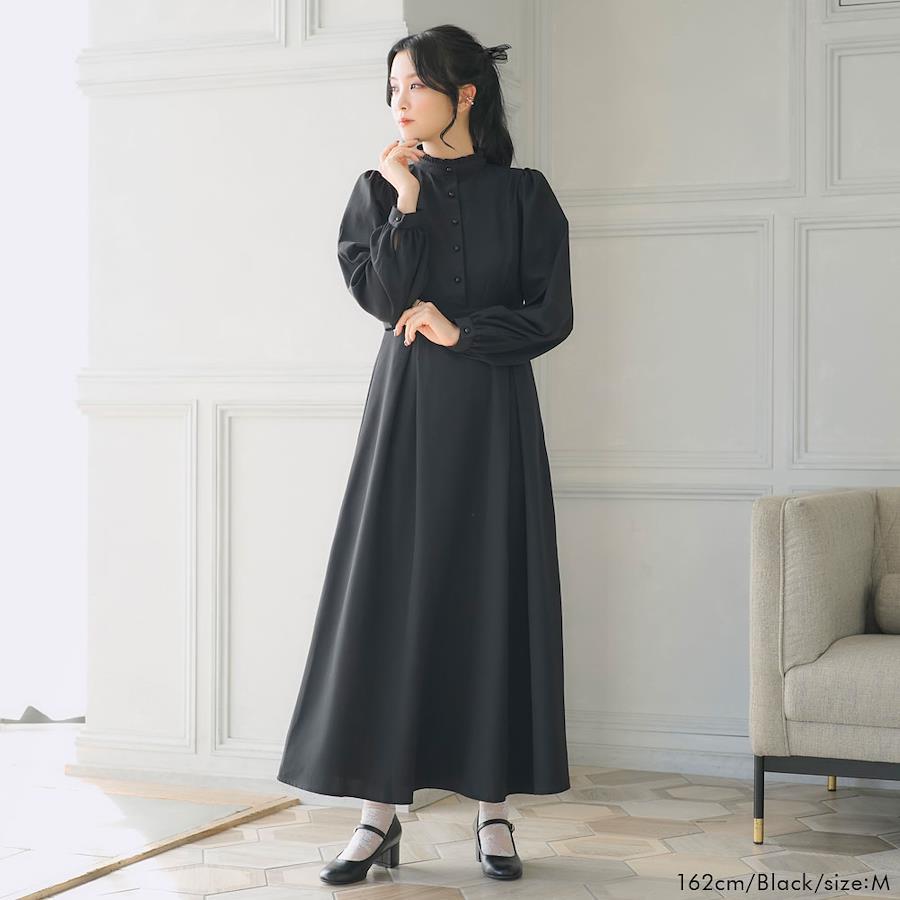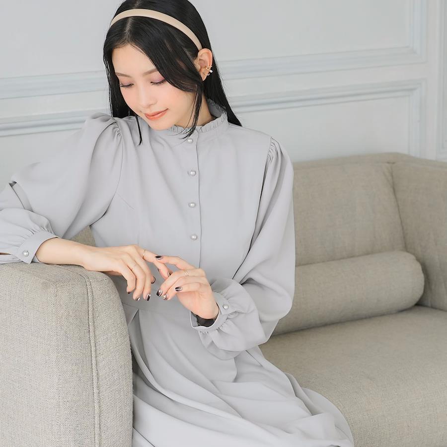 プチフリルをあしらったスタンドカラーが上品なデザイン。