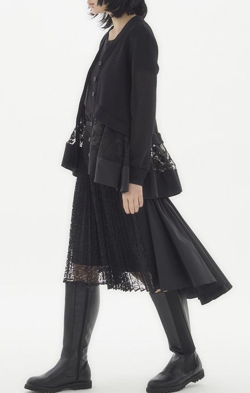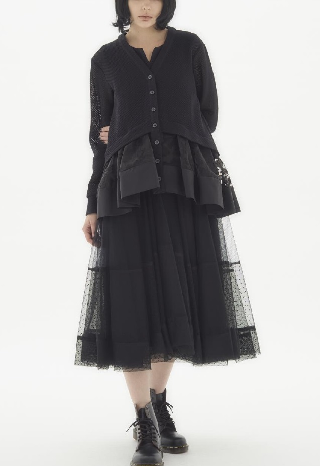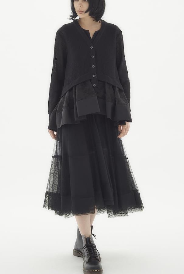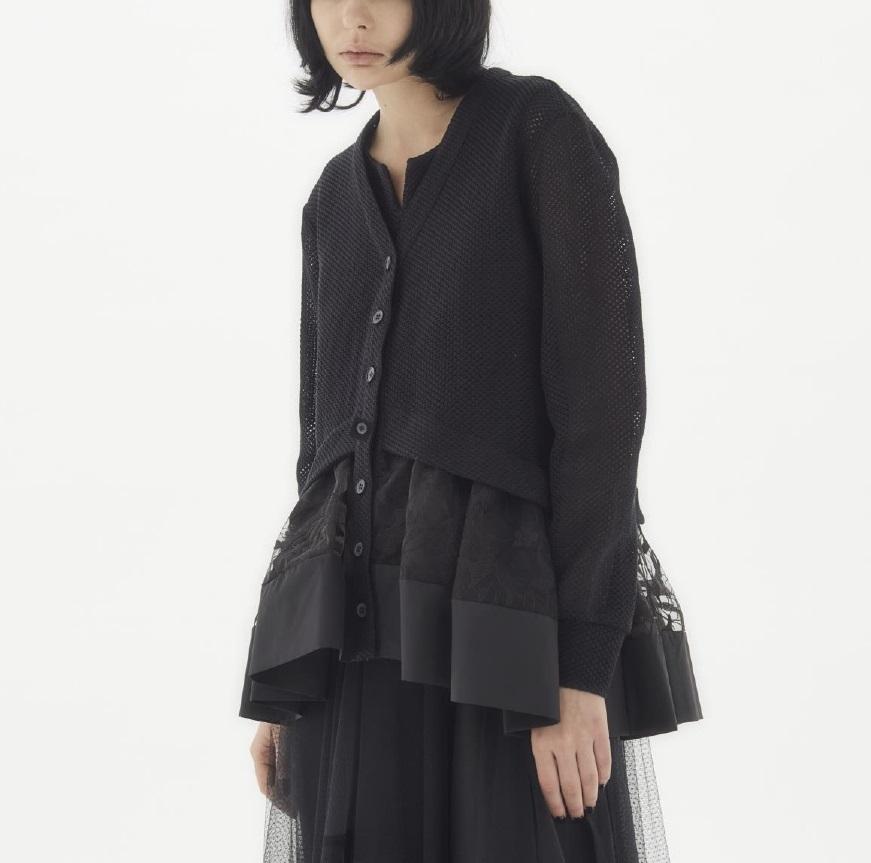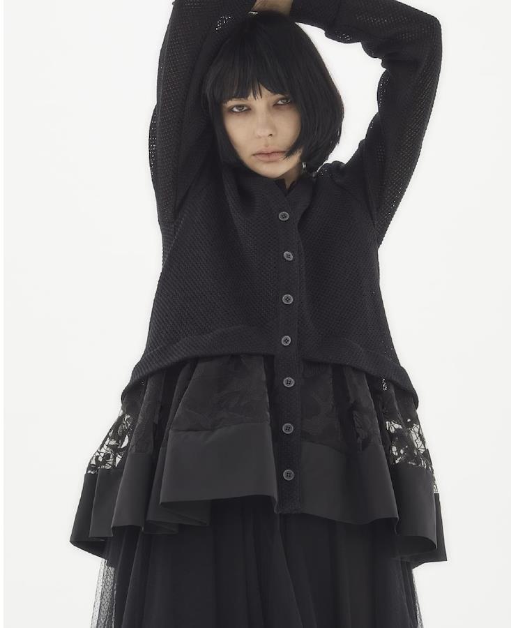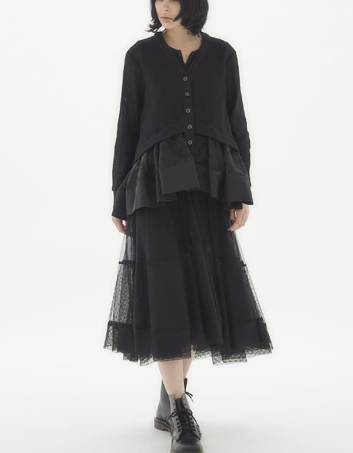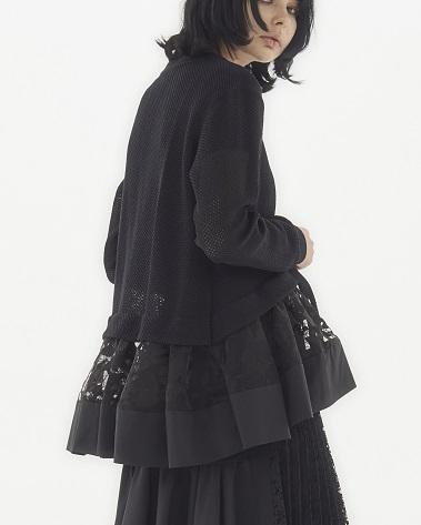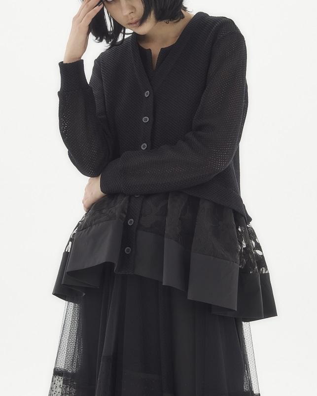 ギマ加工を施したラッセル編みの生地を使用した、軽やかでシャリ感のあるカーディガン。裾には刺繍入りのオーガンジーを重ね、繊細な透け感と立体感が魅力です。異素材のコントラストが印象的で、羽織るだけでスタイリングが華やぐ一着です。