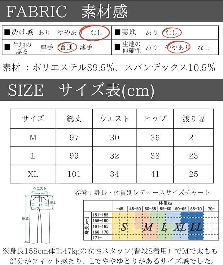 「素材」ポリエステル89.5%、スパンデックス10.5% 「カラー」ブラック、ダークネイビー「サイズ(cm)」M 総丈97/ウエスト30/ヒップ36/渡り幅21 L 総丈99/ウエスト32/ヒップ38/渡り幅23 XL 総丈101/ウエスト34/ヒップ41/渡り幅25