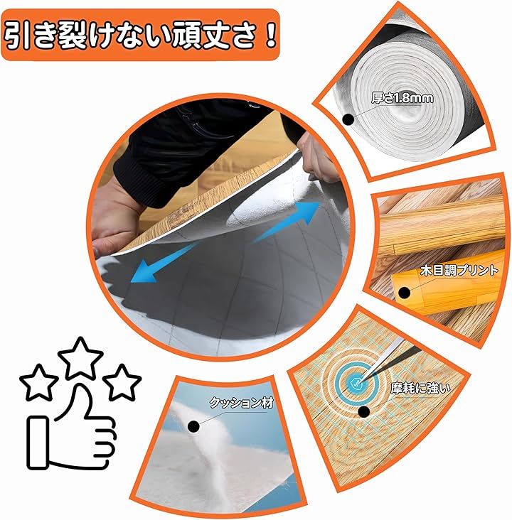 本製品は、厚さ約1.8mmのクッション構造で、やさしい踏み心地と防音性を兼ね備えたフロアマットです。