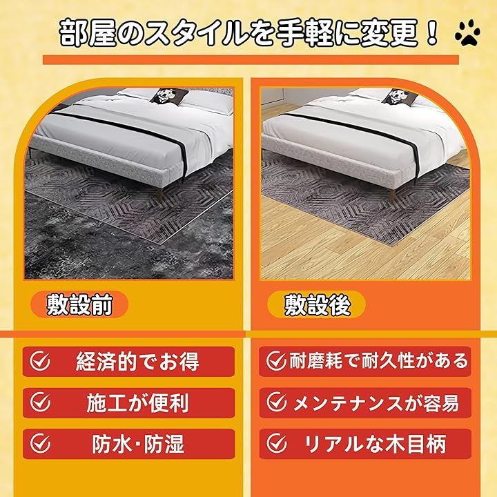 「簡単設置・どこでもOK」ハサミやカッターで自由にサイズ調整ができ、敷くだけで手軽にリフォーム気分をお楽しみいただけます。