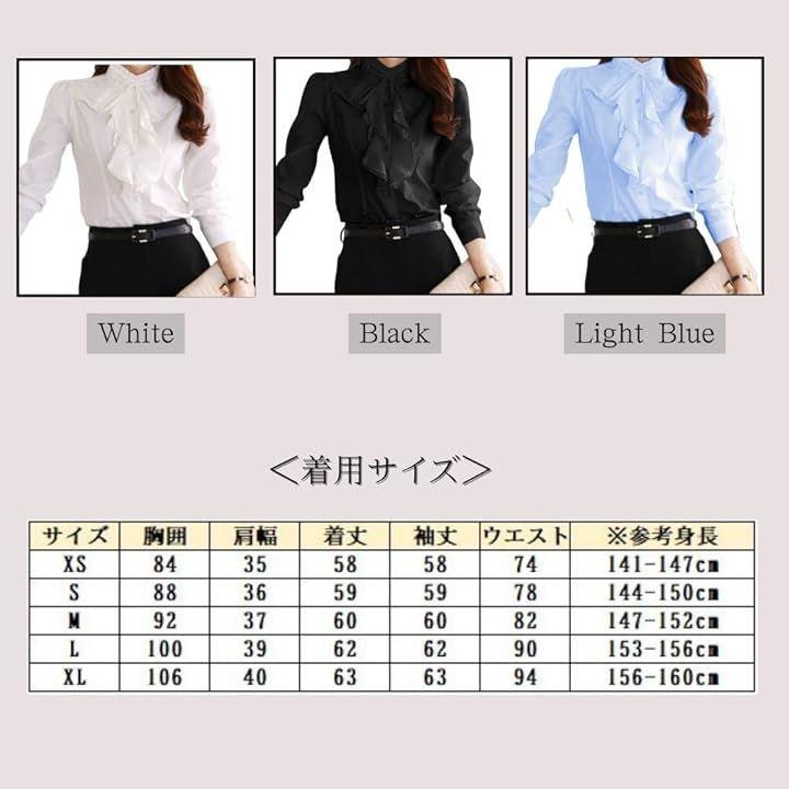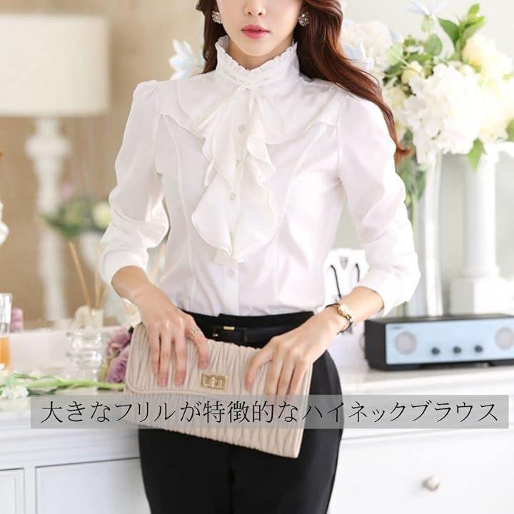 胸元のフリルと大きめのリボンが印象的な長袖のフリルブラウス。
