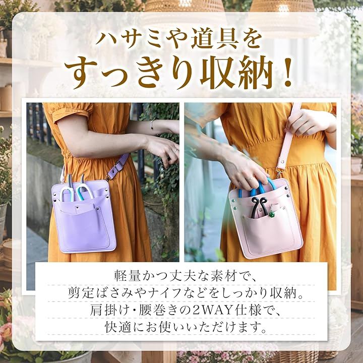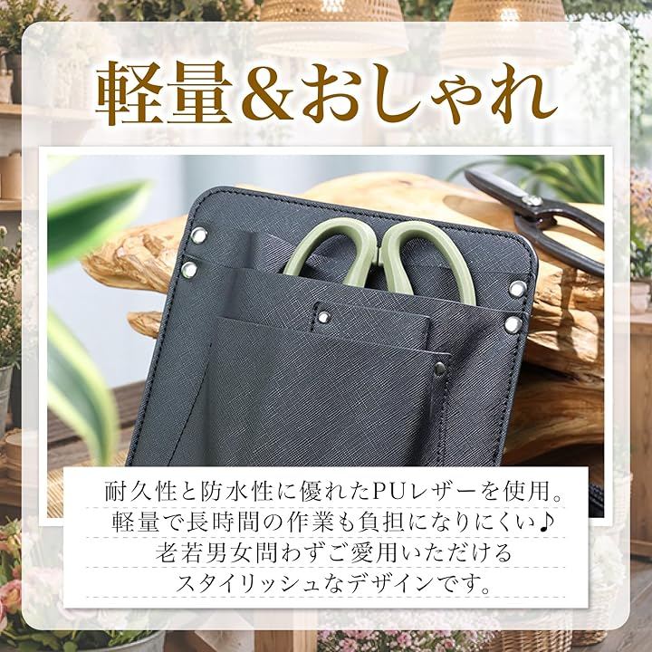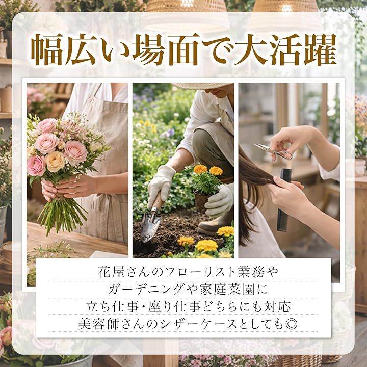 「幅広いシーンで大活躍」花屋さんのフローリスト業務に/ガーデニングや家庭菜園に/庭木の剪定や庭仕事に/立ち仕事・座り仕事どちらにも対応/美容師さんのシザーケースとしても/おしゃれな作業用ポーチ