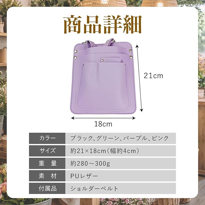 「商品詳細」カラー:ブラック、グリーン、パープル、ピンク サイズ:約21x18cm(幅約4cm) 重量:約280~300g 素材:PUレザー 付属品:ショルダーベルト *モニター環境により色味が異なる場合があります。