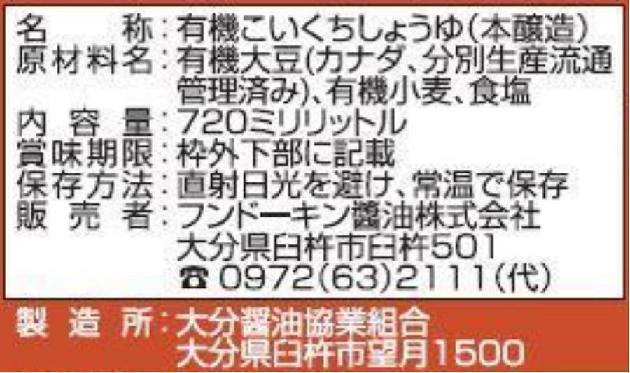 フンドーキン?油 有機栽培濃口醤油 720ml